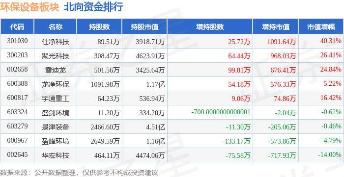 北向资金方面,当日环保设备板块北向资金持有股市值为8.57亿元,增持0.19亿元。其间增持最多的是仕净科技,增持了0.11亿元。减持持最多的是华宏科技,减持了717.93万元。环保设备板块北向资金持股变化明细见下表:
