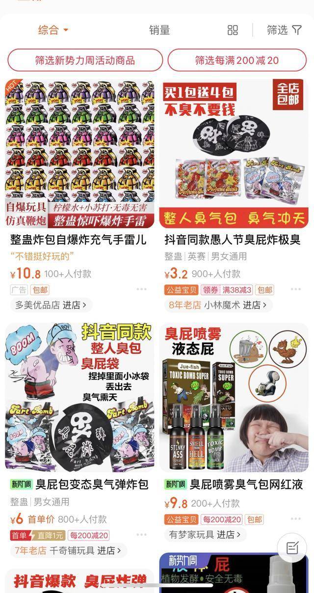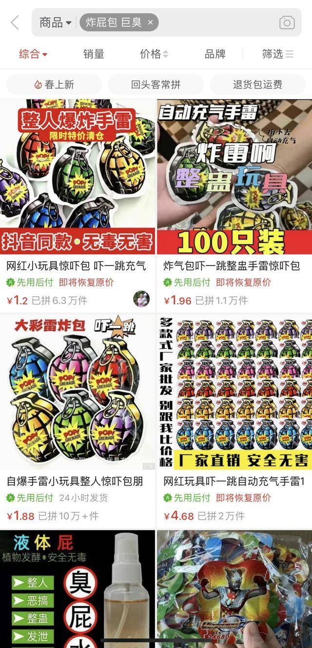 为实在保护未成年人的合法权益和人身安全,标准校园周边玩具市场秩序,近来,区消保委组织志愿者造访城区内部分中小学周边的文具店及超市,就“炸包”“臭包”等“新奇特”玩具展开排查,暂未发现金山有出售“炸包”“臭包”等相似玩具的现象。但志愿者们发现,在输入“炸屁包”“臭屁”等关键词后,仍能够在不少网络站点渠道找到相关售卖链接。